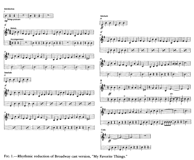 Figures 1 and 2 help illustrate the nature of these transformations by presenting transcriptions of the melody and rhythmic framework of the ensemble accompaniments in the original Broadway cast recording of “My Favorite Things” and the John Coltrane version, respectively[4]. The Broadway arrangement supports the sung melody with an accompaniment that alternates pizzicato rhythmic figures with sustained harmonies in the strings (mm. 5-20). The rhythmic figure in the interlude is the “um pah pah” figure typically associated with the waltz (mm. 21-22). This rhythm provides the main accompaniment for the second and third A sections of the tune (see fig. 3). Musical contrast in this arrangement is generated through alternation of short and sustained instrumental sonorities, through changes in dynamics (compare measures 21 and 39), and by changes in mode (from minor to major in the third A section). The arrangement supports the clear articulation of the text with an unsyncopated rhythmic framework.